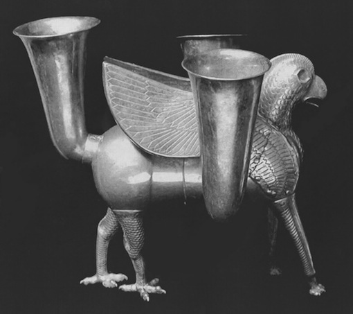 “The artifact is a hollow silver vessel, formed from several joined units to create a winged, open-mouthed griffin, walking on both clawed and perhaps hoofed feet. Its body is furnished with three large upright funnels, two attached at the sides, the third inserted into the raised (surely uncomfortable) enlarged aperture of the creature’s anus. I have no information about the manufacturing method except for the presence of binding rivets in its legs. From a photograph showing a scale, it appears to be small, with a width of 8 inches/20 cm. and a full height of 7 inches/ 17.5 cm. The vessel has been consistently labeled a rhyton in print, but this would be correct only if the creature’s open mouth served as a pouring spout for liquids poured into the funnels (wine, water, body wastes?). . . . It is a modern Iranian artifact. For stylistic and technical reasons — the griffin’s head is frozen mute, its eyes stare, the head, wing and leg patterns are awkward and meaningless, and the leg rivets are modern: all attributes unlike any ancient conception — I condemned it as a forgery.”