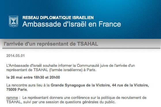 The notice, dated 1 May, stated that “The Embassy of Israel wishes to inform the Jewish community of the arrival of a representative of the IDF (the Israeli army) in Paris.”