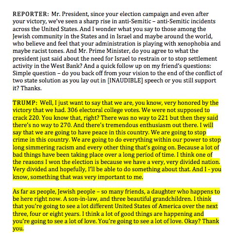 This whole answer from Trump, being asked about anti-Semitism in the U.S. Read the whole thing:
