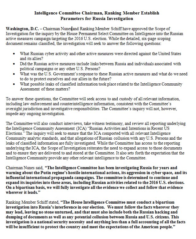 The House Intelligence Committee has agreed on parameters of its investigation of alleged Russian meddling into the 2016 presidential election. Without naming President Donald Trump in its announcement, the panel said it would look into "links between Russia and individuals associated with political campaigns or any other U.S. Persons."