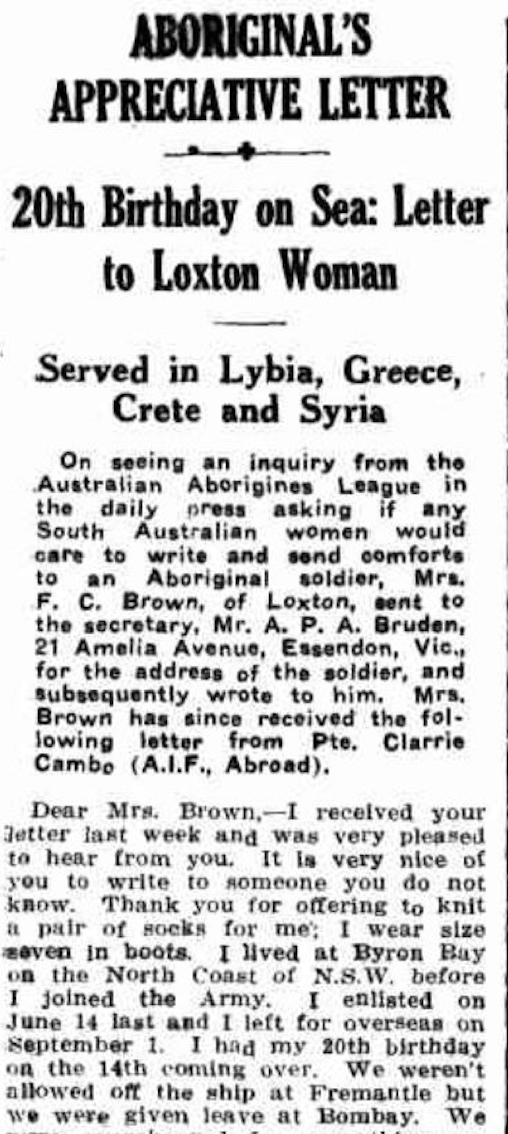 During the second world war, a young Aboriginal soldier, Private Clarrie Combo from New South Wales, exchanged mail with Mrs F. C. Brown from Loxton, South Australia — a white woman whom he had never met.