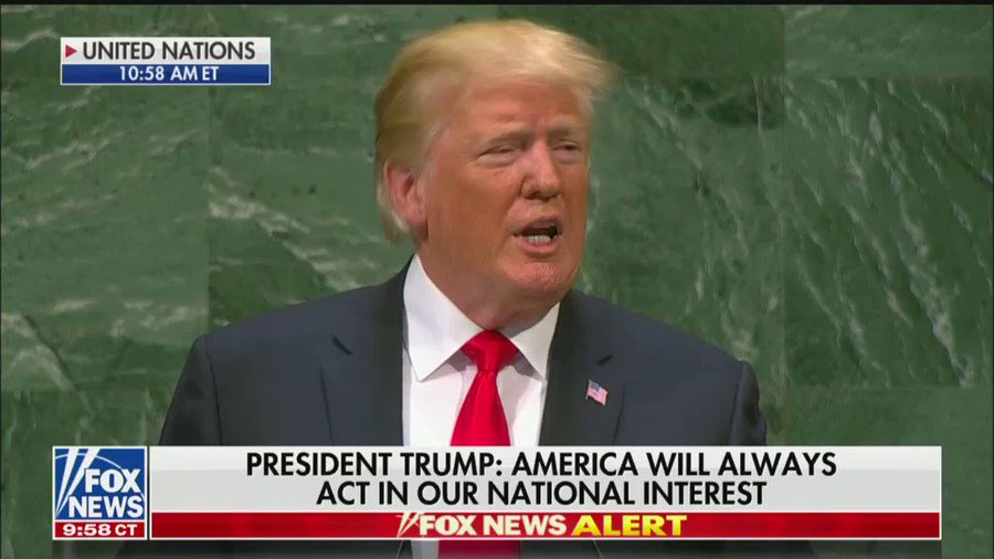 - 25 September 201815:15 GMTTrump says that people around the world watching him speak have the same "heart of a patriot" for their own individual nations. He says that this patriotism has inspired scientific breakthroughs and great art. "Our task is not to erase it, but to embrace it," he says.