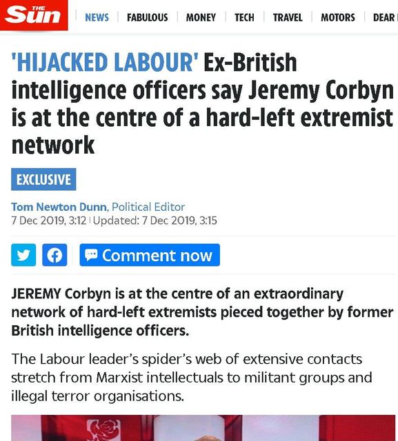 On Saturday, the Sun published, “‘Hijacked Labour’: Ex-British intelligence officers say Jeremy Corbyn is at the centre of a hard-left extremist network.”