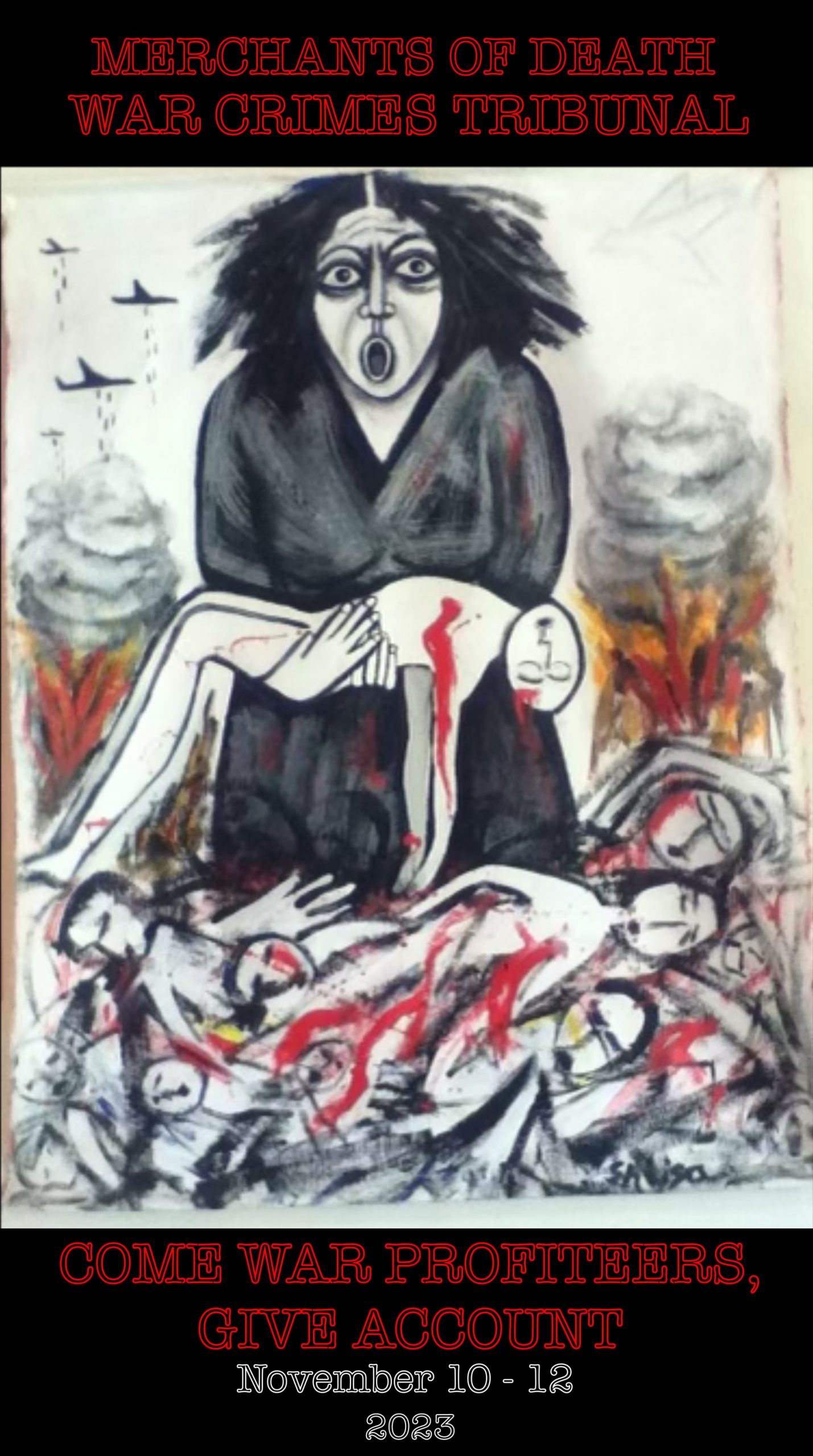 I am very honored that my painting, Collateral Damage, has been chosen as the logo for the Merchants of Death War Crimes Tribunal. The painting’s image of the powerful mother represents the power of the people’s Tribunal, fighting for the peace and justice we demand.