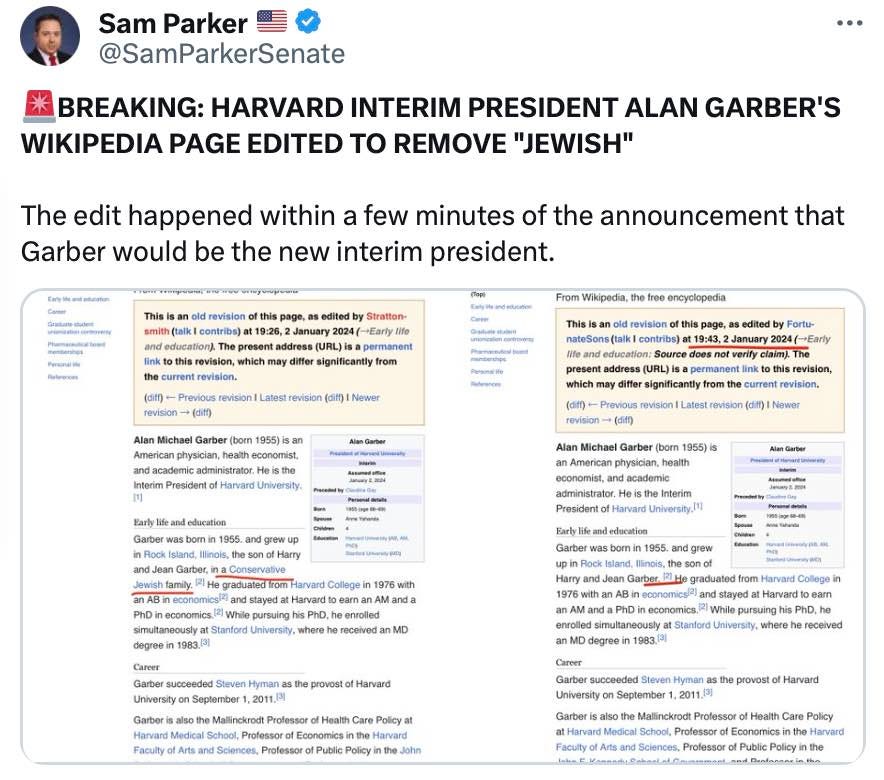 The terrifying rise of anti-Semitism has reached a whole new level of horrifying scariness. In a frighteningly alarming development that has left all right-thinking people quaking with fear, the Jewish identity of Harvard University’s new president Alan Garber has been mysteriously erased from Wikipedia.