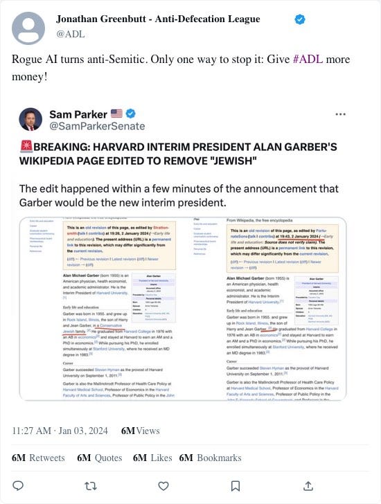 Will the rogue AI program that erased Alan Garber’s Jewishness succeed in removing all references to Jews and Jewish identity from the internet? Will its misguided attempt to “solve the Jewish problem” lead it to change the names of synagogues like Temple Bet Midler to Our Lady of the Episcopal Holyrolling Transubstantiation Church? Will it tell us that Joe Biden’s cabinet is no longer a Jewish minyan? Will it turn bagel shops into brathauses? Will it change all the maps of the Holy Land back to “Palestine”?